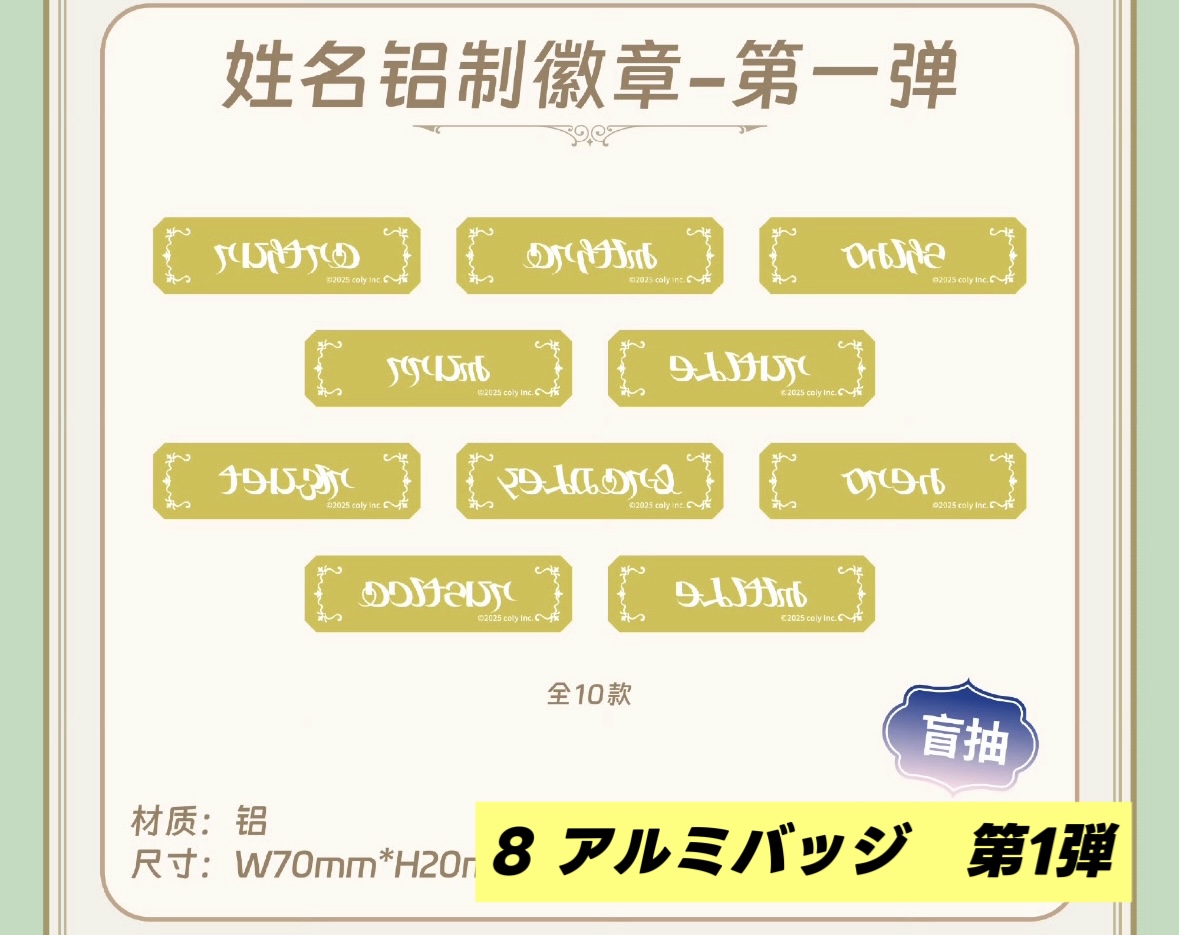 | 10 | 1240 | 8 アルミバッジ 第1弾(ランダム) | 70*20mm(全10種・ランダム) |