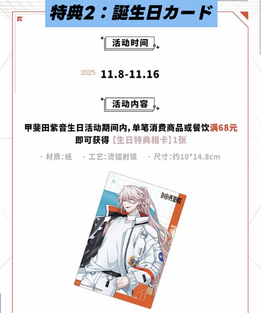 | 特典2:誕生日カード(紫音) | 送料以外2600円こと、1枚(11月12日まで) |